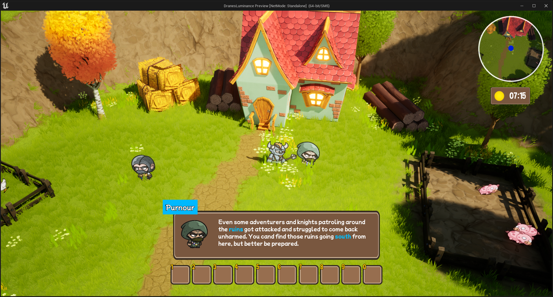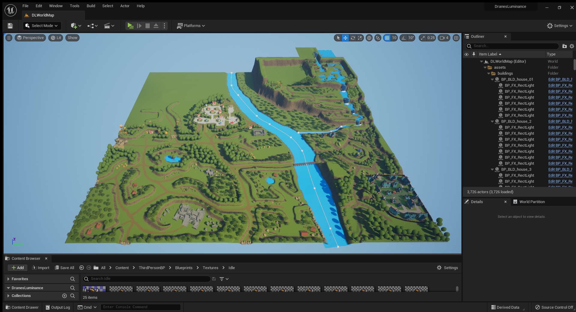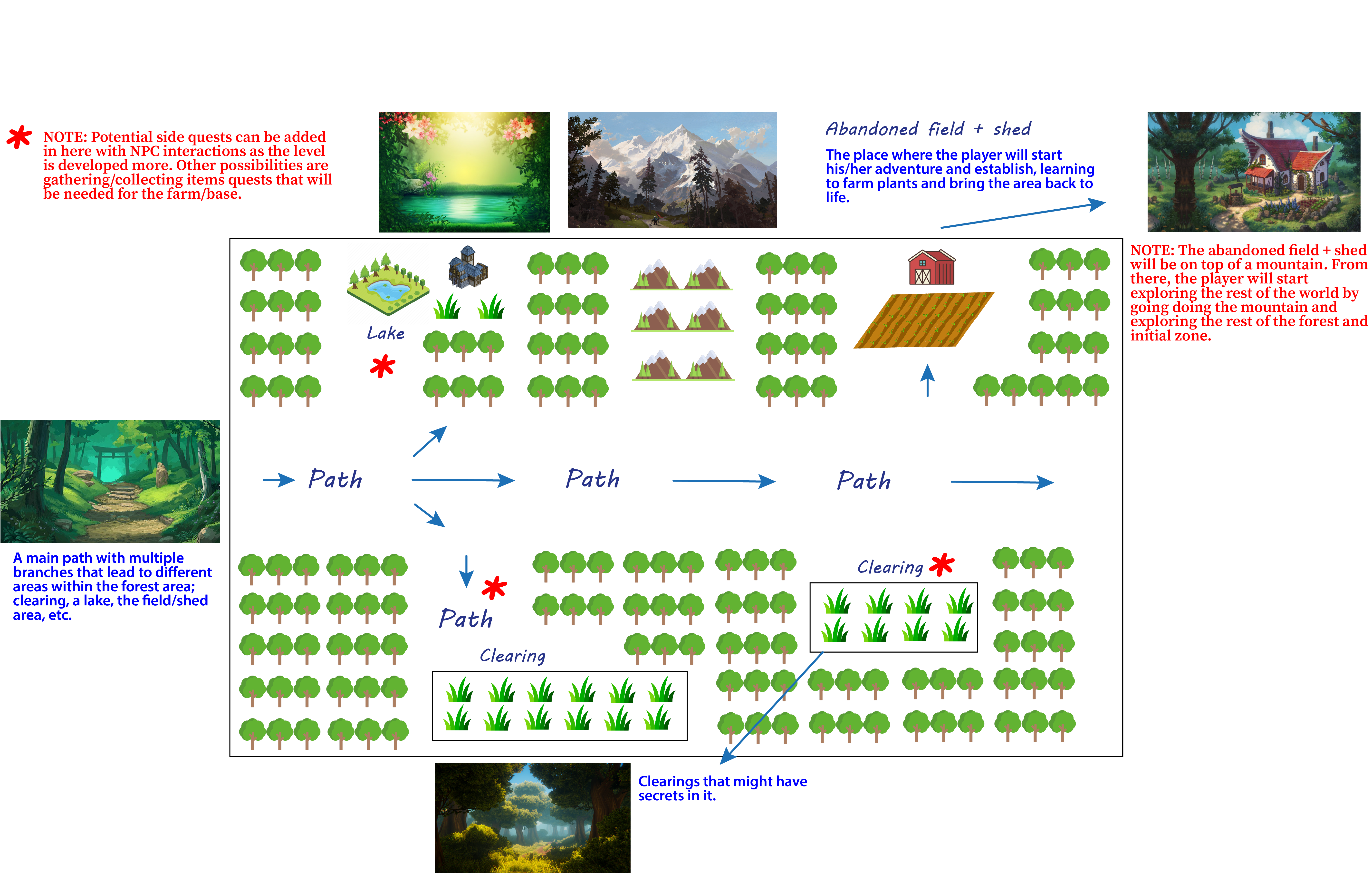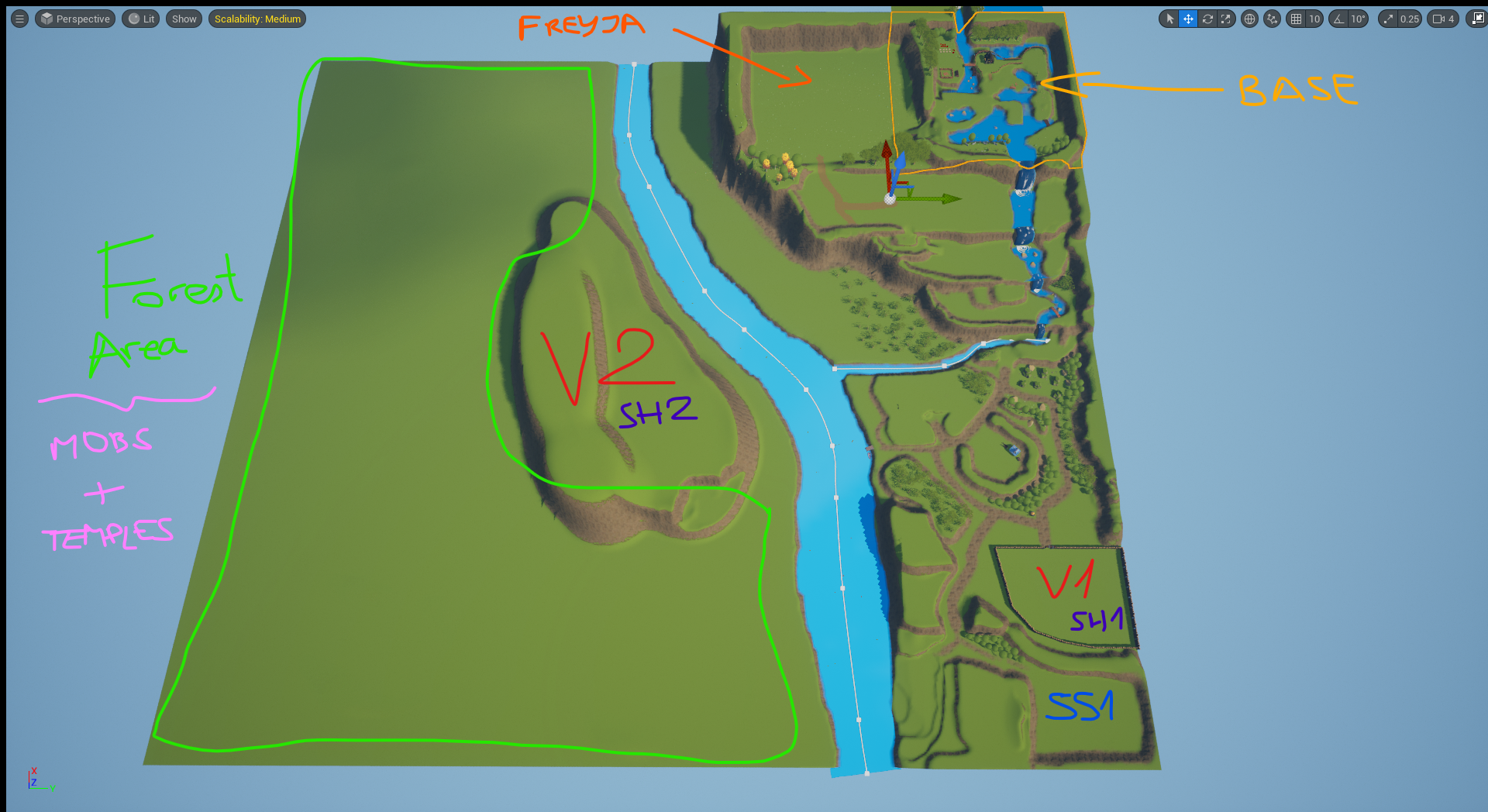 - Dressing up the level, placing assets and setting the mood for each of the different areas (villages, ruins, player start...)