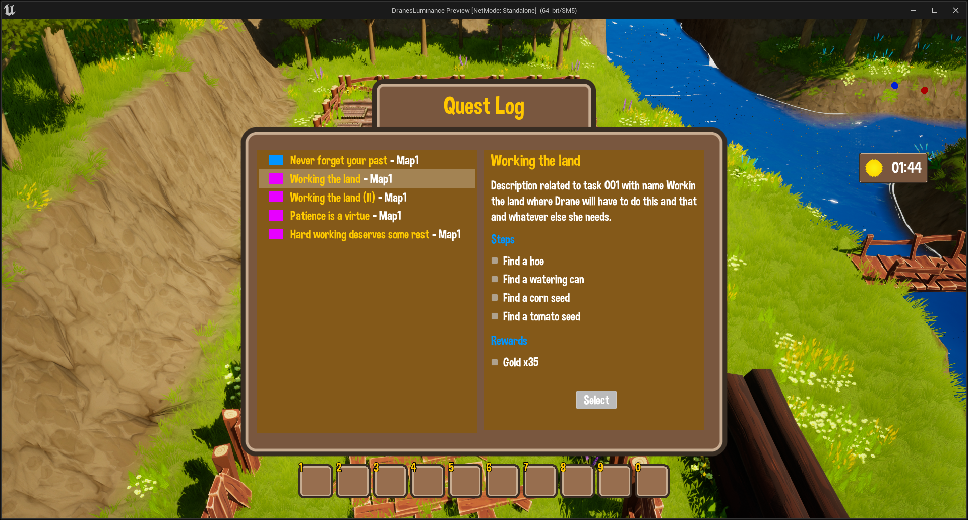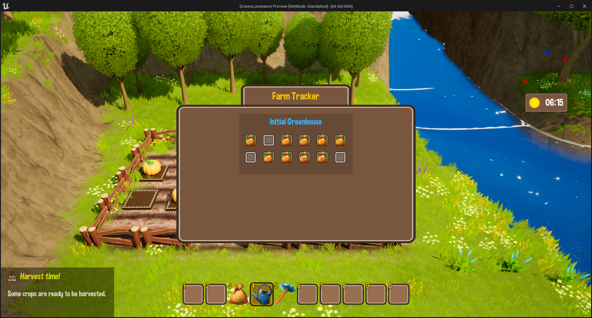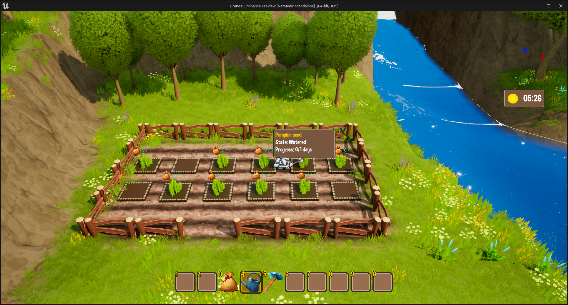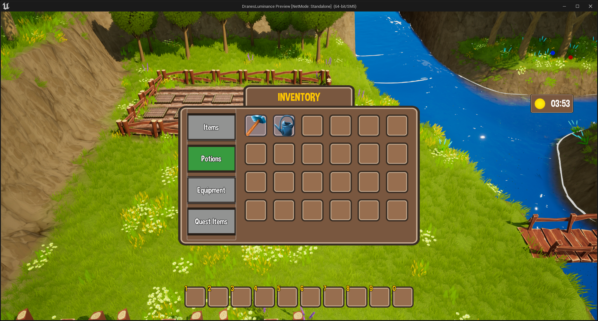 Farming is an important part of the game as the player will be able to obtain different types of seeds and plant them. When finding a plot, he will be able to decide which seed to plant by selecting it from the hotbar placed at the bottom of the UI. Upon deciding, the seed will start to grow. Farming is central to crafting; through farming you will be able to yield potions, items, upgrades to weapons, etc. Farming offers income to the player too for other matters and items they might need inside quests or tasks related to a concrete trial.