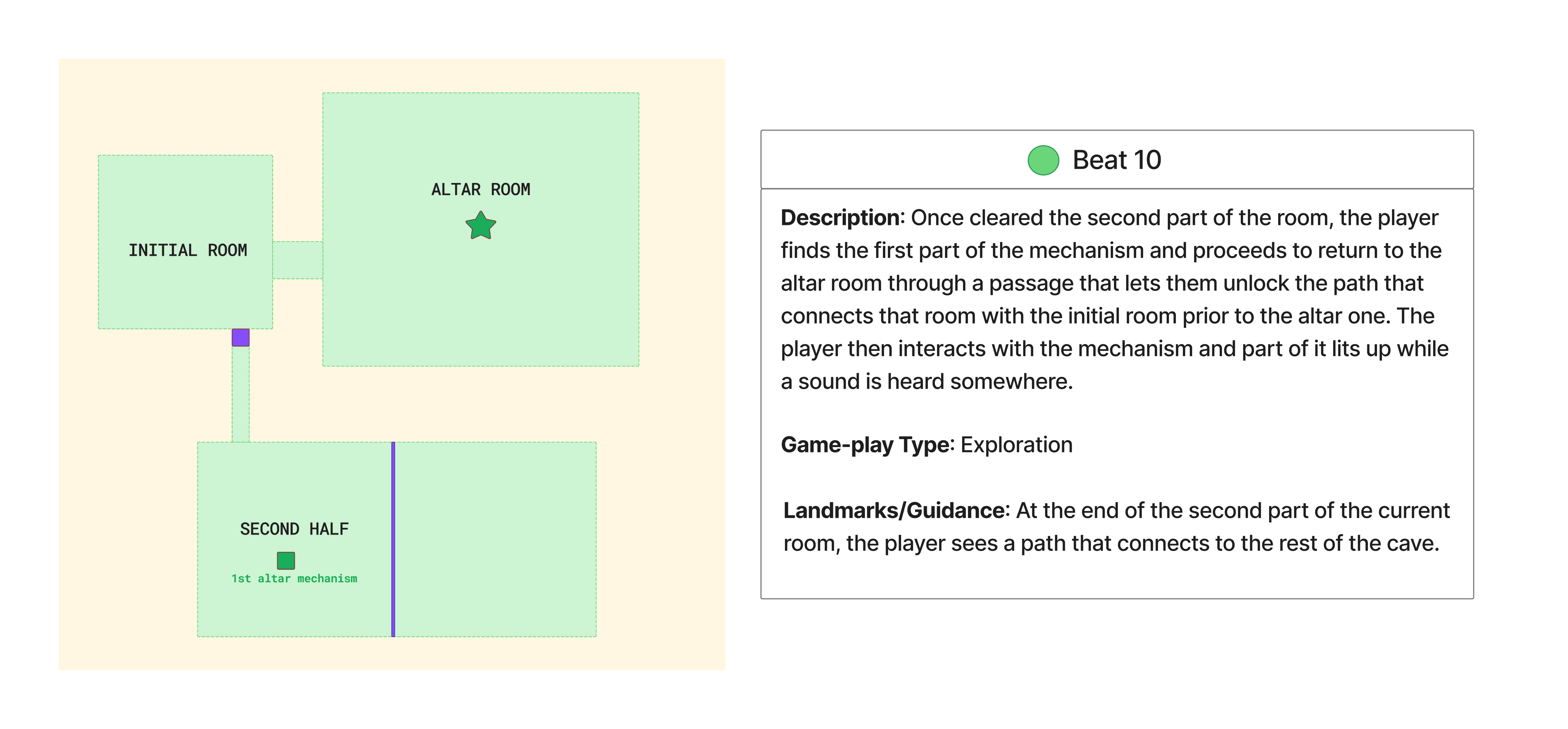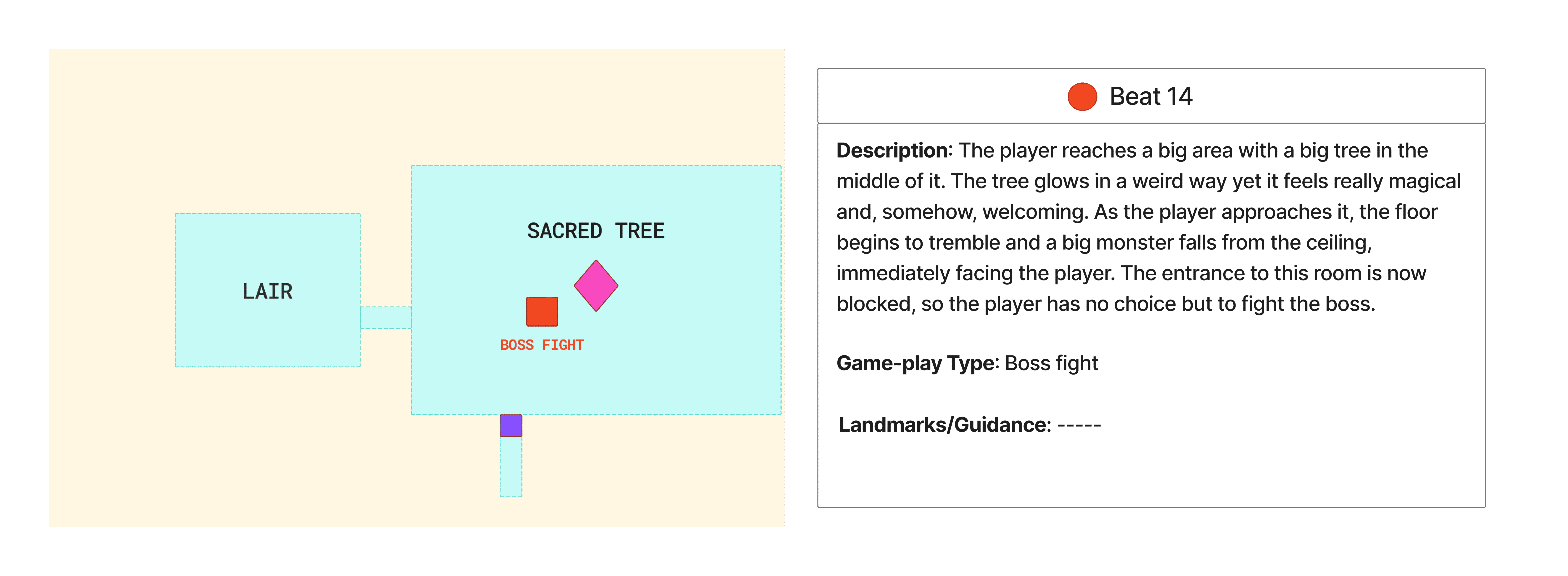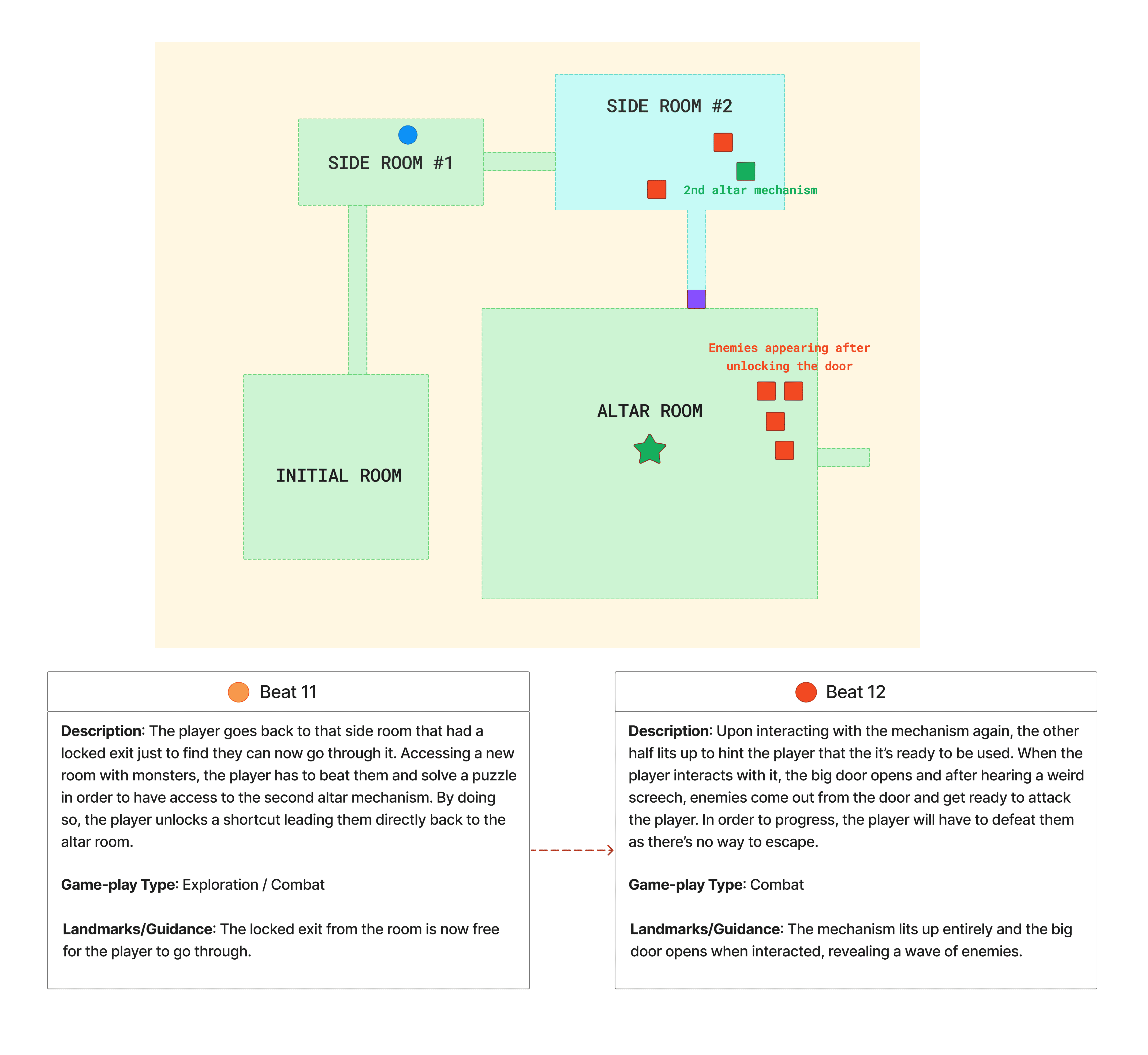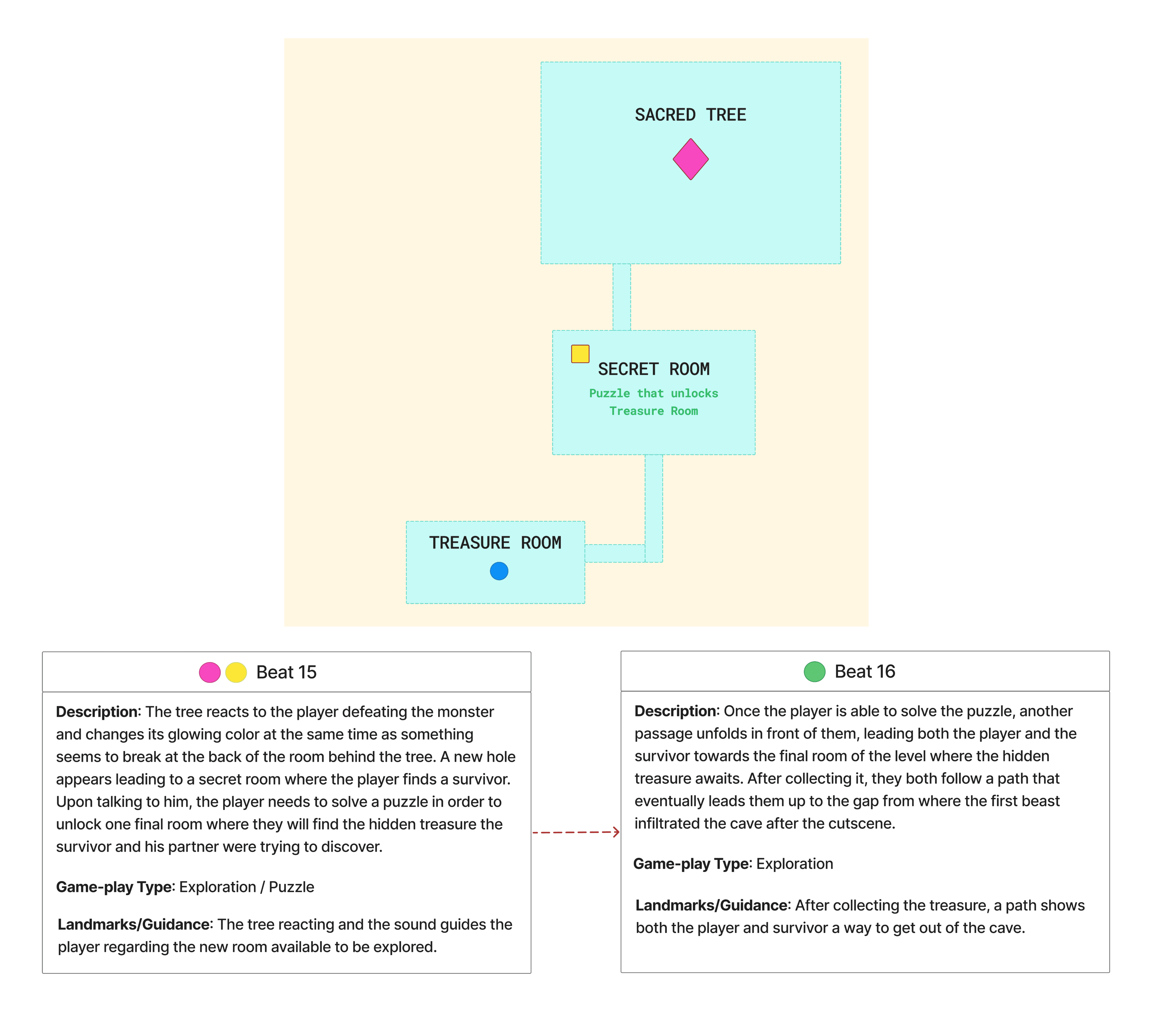 In order to further explain the Beat Chart, and given that a beat can be seen as a small self-contained chunk of a level and that several of them for a level, I have splitted the 2D map into pieces, each of them associated with one or more beats that are directly connected.