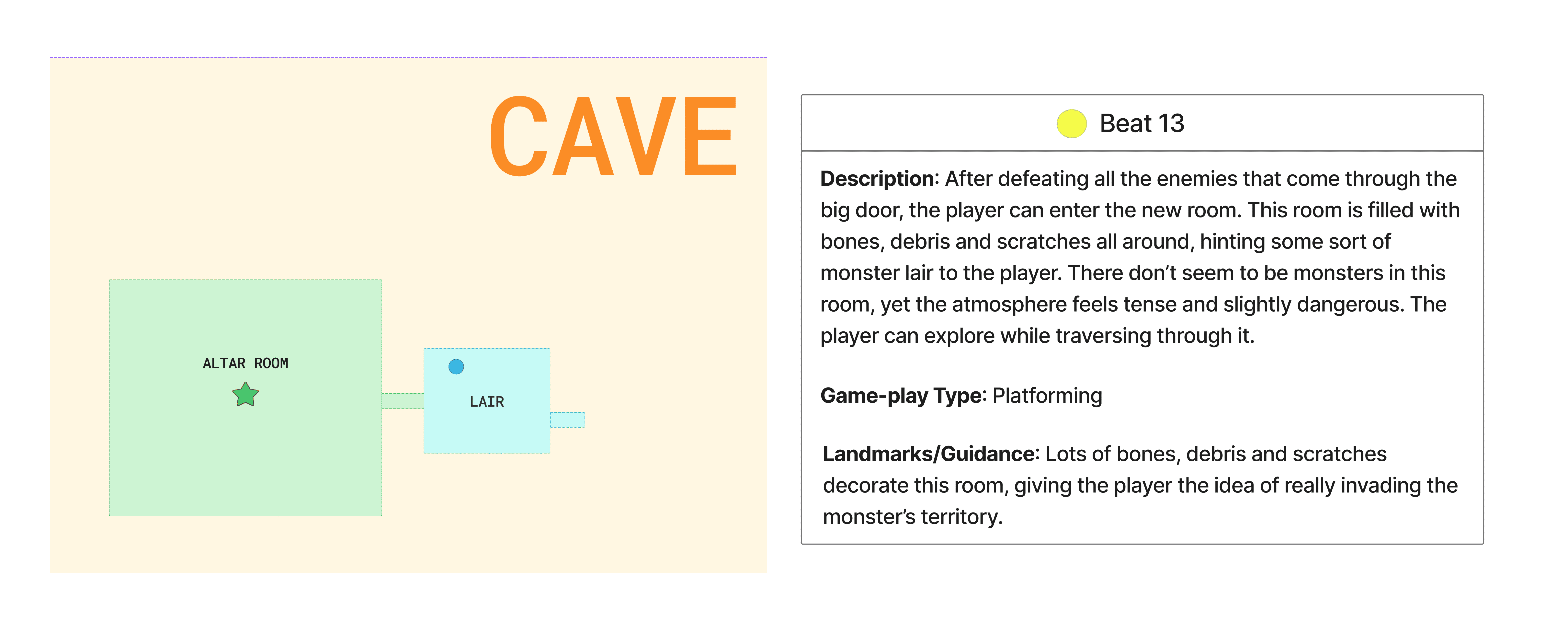 The rooms forming the Lower level add some more depth into the cave by being in a lower height compared to the previous chambers. With this the players' sensation of getting deeper into the level and closer to the monsters' territory increases, highlighted by the fact that the first room they encounter when accessing the lower level past the Altar Room seems to be some sort of monster lair.