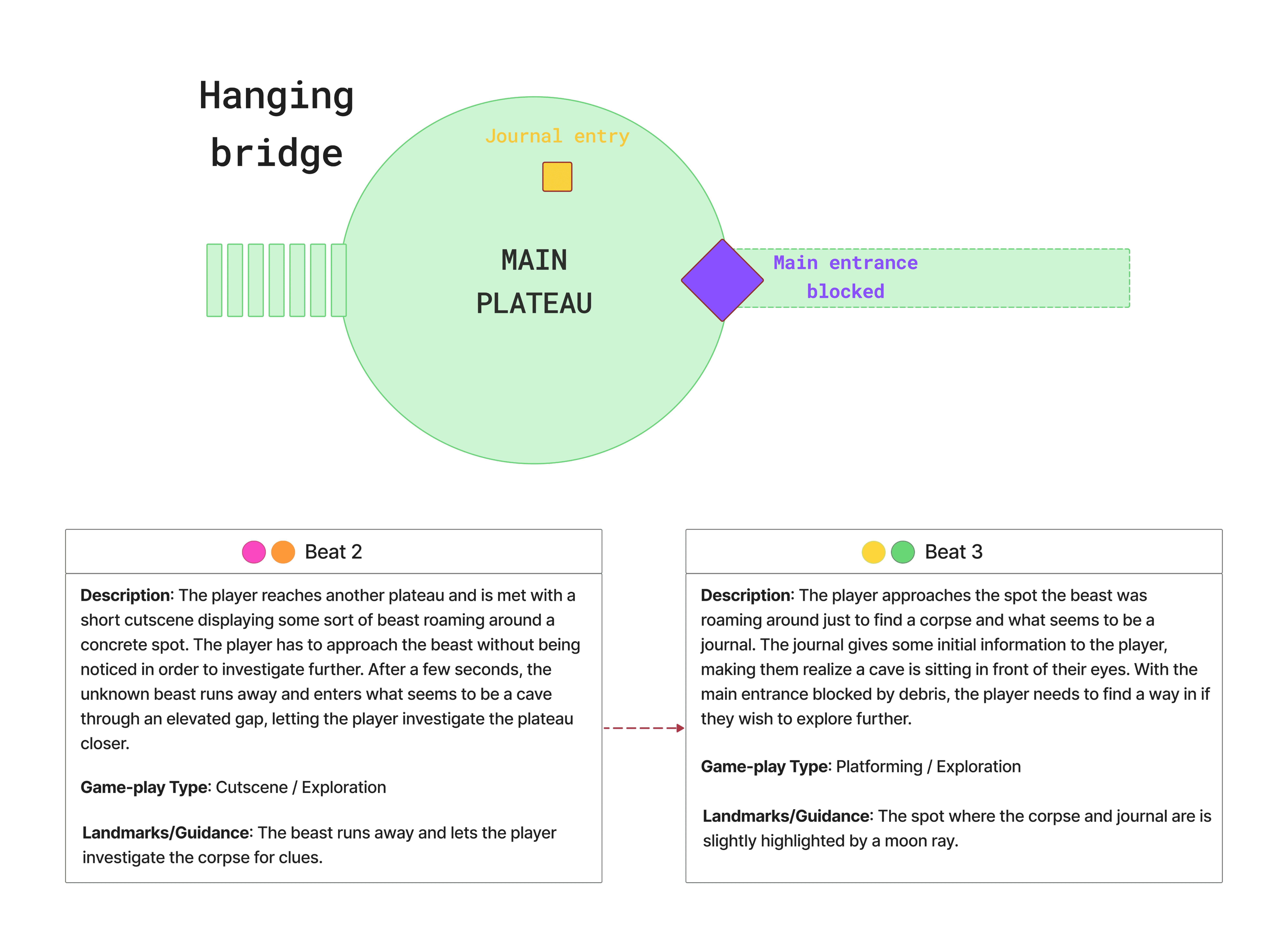 - Narrative: The players can find a Journal entry at the start of the level that will give them more information about what happened. After defeating the boss, they will encounter the second narrative element. The main idea is to give little to no narrative guidance, so the players need to understand the situation and learn what can help them explore and what not as they play the level.