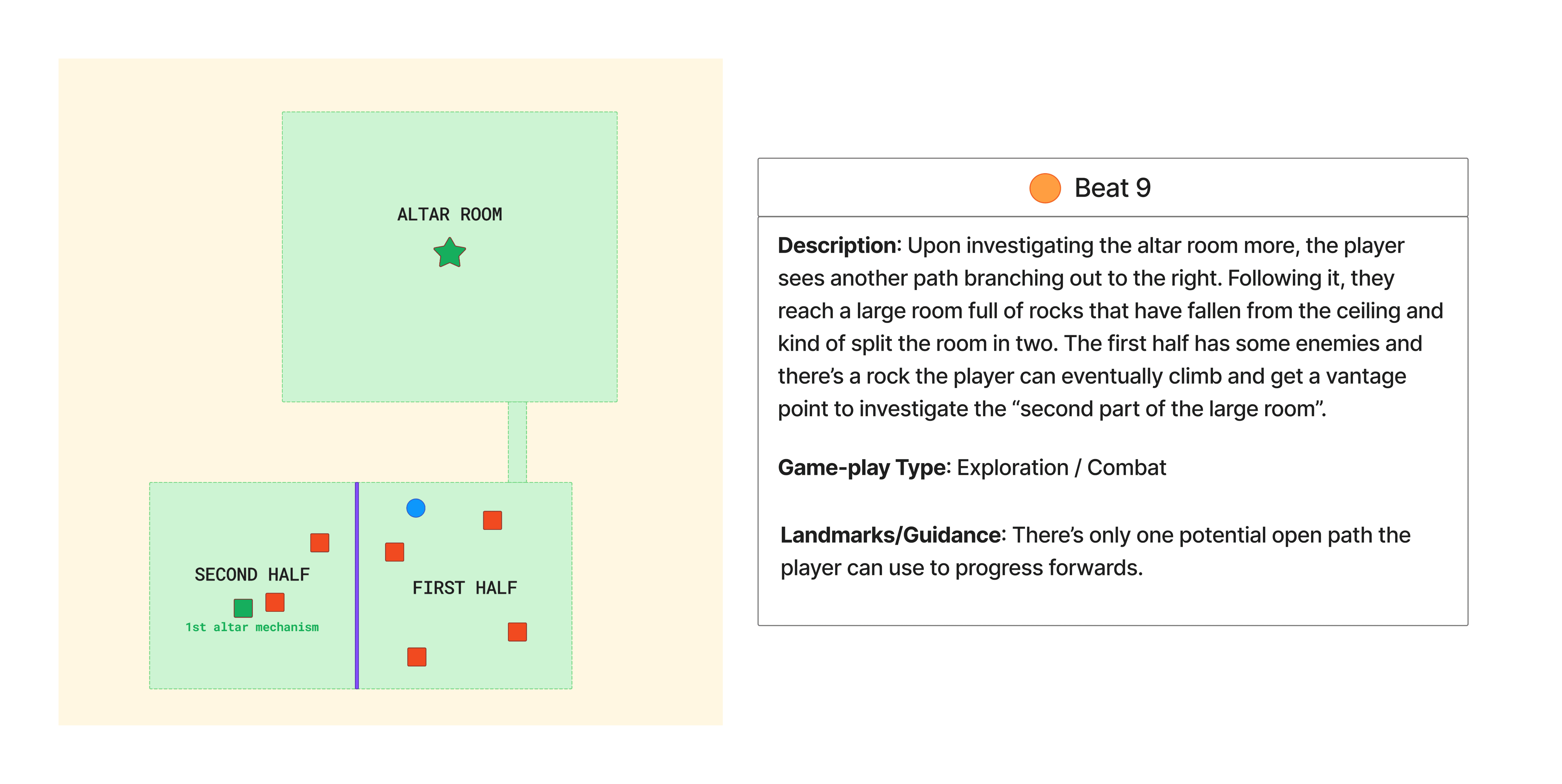 If following the main path, the players reach another big area with an altar in the middle acting as POI and some sort of mechanism to unlock a big door. There's one enemy guarding the altar that they can kill and get loot and a potential clue. Once again, the elements in the room offer stealth opportunities for the players to approach the beast and perform a surprise attack.